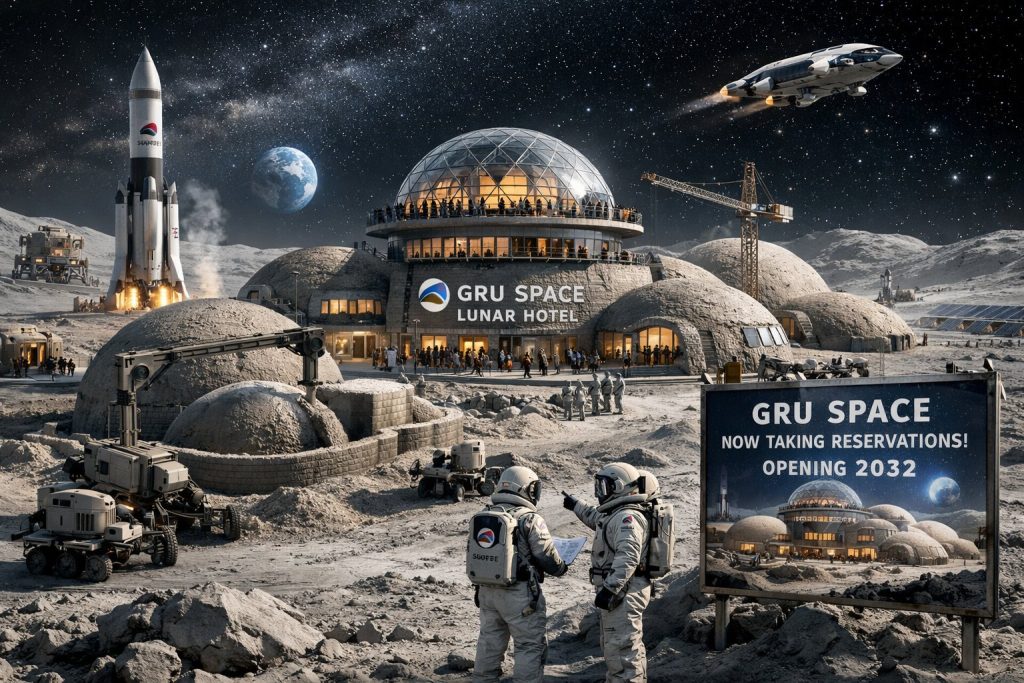 Uma startup norte-americana chamada GRU (Galactic Resource Utilization Space) afirma que começou a vender reservas para um hotel na Lua por cerca de US$ 1 milhão — aproximadamente R$ 5,3 milhões. O projeto tem previsão de inauguração em 2032, mas depende de aprovações regulatórias para sair do papel.