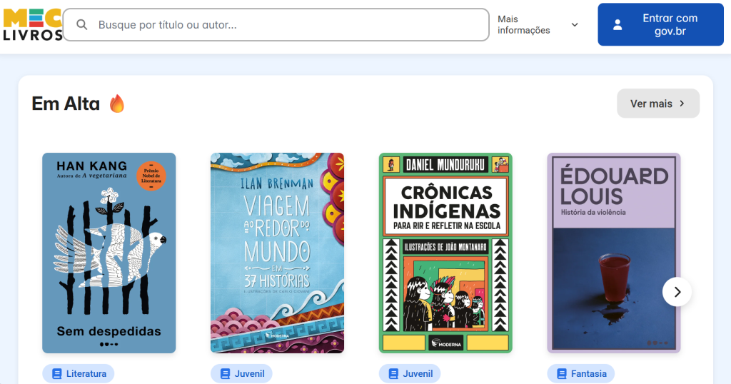 Para acessar o MEC Livros, é preciso entrar na plataforma com a conta gov.br e, depois, seguir para uma página em que o usuário pode escolher seus gêneros literários favoritos para adaptar a experiência às suas preferências.